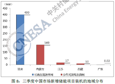 2016年三季度,中國新增投運項目3個,裝機規(guī)模1.5MW,同比增長50%,環(huán)比今年二季度下降了87%。項目全部集中在分布式發(fā)電及微網(wǎng)領域。
