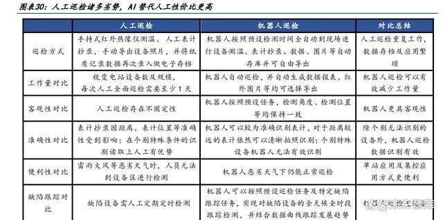 人工巡檢諸多劣勢(shì),AI 替代是大勢(shì)所趨。電力行業(yè)有大量巡檢工作條件惡劣,傳統(tǒng)人工 巡檢的工作難度大、危險(xiǎn)指數(shù)高、及時(shí)性低、工作量大;采用智能巡檢,既具有人工巡檢 的靈活性和智能性,同時(shí)響應(yīng)更加及時(shí)、效率更高、成本更低,隨著技術(shù)的發(fā)展,智能機(jī) 器人技術(shù)具有廣闊的應(yīng)用前景,未來電氣行業(yè)無人化巡檢將成為行業(yè)常態(tài)。 AI 替代人工性價(jià)比更高。以 500kv 變電站為例,人工巡檢模式下需要 4 個(gè)工人耗費(fèi)一個(gè) 禮拜的工時(shí)才能進(jìn)行一次全面檢查,假設(shè)每位工人年薪約 8 萬,而同樣的工作量,一臺(tái)巡 檢機(jī)器人能在更短的時(shí)間內(nèi)完成,其平均成本為 65 萬/臺(tái),計(jì)提折舊后約 16 萬/年,使 用巡檢機(jī)器人比人工巡檢能節(jié)約 16 萬/年。