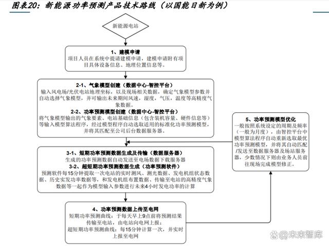 功率預(yù)測技術(shù)路線主要包含數(shù)據(jù)計(jì)算、傳輸及模型優(yōu)化。以國能日新為例,公司基本實(shí)現(xiàn) 功率預(yù)測算法模型的自動(dòng)匹配及預(yù)測數(shù)據(jù)的自動(dòng)計(jì)算發(fā)送,因此在項(xiàng)目日常營運(yùn)端,人力 投入較少,僅在少數(shù)場站模型遠(yuǎn)程匹配失敗的情況下,由業(yè)務(wù)人員前往現(xiàn)場完成模型修正。 在模型優(yōu)化方面,一般會(huì)按照設(shè)定的周期,由智控平臺(tái)中的模型算法程序自動(dòng)重新選取最 優(yōu)功率預(yù)測模型,并將其自動(dòng)匹配至站場服務(wù)器。