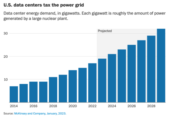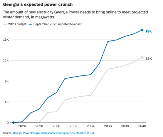 在佐治亞州,對工業(yè)電力的需求正在飆升至歷史新高,預計未來十年的新增用電量將是現在的17倍。亞利桑那州公共服務公司是該州最大的公用事業(yè)公司,它預計如果不進行重大升級,21世紀末將嚴重缺電。弗吉尼亞州北部所有計劃和在建的新數據中心需要幾個大型核電站才能保障供電。德克薩斯州在炎熱的夏季電力短缺已經成為常態(tài),也面臨著同樣的困境。
