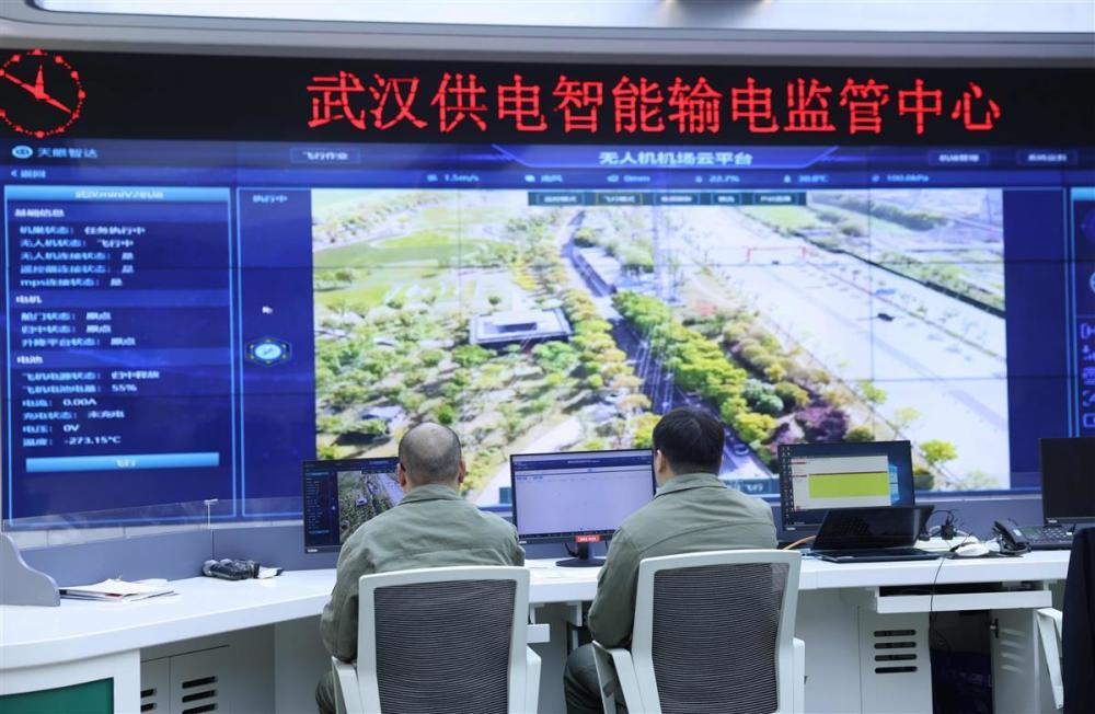 10月23日,武漢漢口江灘,一架白色的無人機在高空穿梭,機頭對準濱江區(qū)內的國家電網(wǎng)線路來回進行掃描、拍攝。與此同時,距離巡檢現(xiàn)場數(shù)公里外的國網(wǎng)武漢供電公司的巨型屏幕上,無人機的超高清畫面即時顯示。
