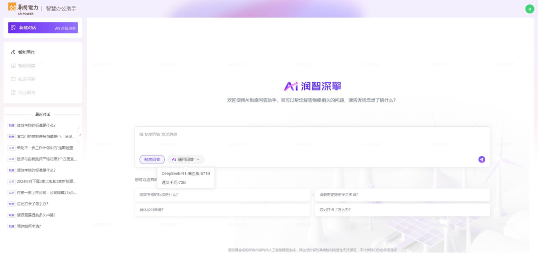 華潤電力基于DeepSeek671B大模型的深度解析能力,對419份制度文件進(jìn)行結(jié)構(gòu)化處理,構(gòu)建制度知識(shí)庫,初步實(shí)現(xiàn)制度問答功能驗(yàn)證。