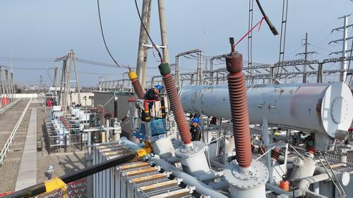 圖為3月26日,該公司人員對220千伏健康變開展主變及開關(guān)例行試驗、設(shè)備維護等操作。