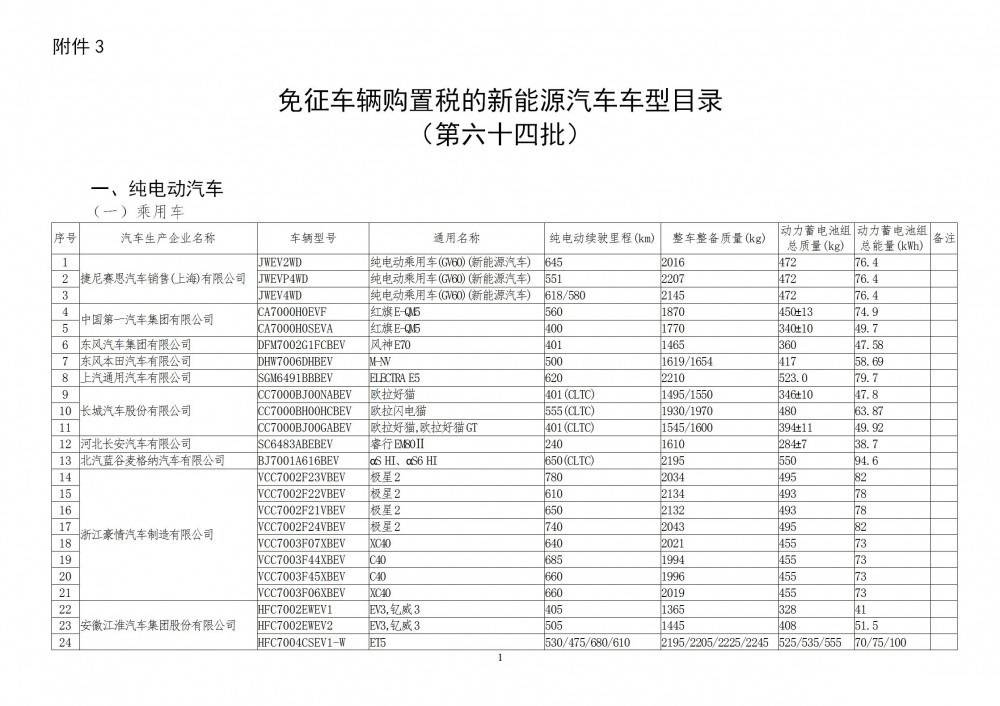 4月17日,工業(yè)和信息化部發(fā)布《免征車輛購置稅的新能源汽車車型目錄》(第六十四批)公告,涵蓋純電動汽車、插電式混合動力汽車和燃料電池汽車三個大的類型。