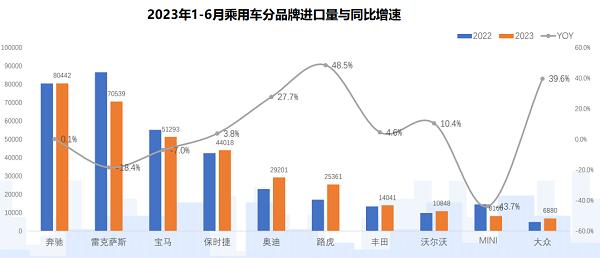 今年上半年,進(jìn)口車(chē)前十品牌中,奔馳、保時(shí)捷、奧迪、路虎、豐田、沃爾沃、大眾等七個(gè)品牌實(shí)現(xiàn)正增長(zhǎng);其中,奔馳同比上升0.1%至80442輛,排名第一。而寶馬和MINI,則由于車(chē)型國(guó)產(chǎn)導(dǎo)致銷(xiāo)量分別下滑7%和43.7%;雷克薩斯也因?yàn)橹髁?chē)型ES系列銷(xiāo)量疲軟下滑了18.4%。