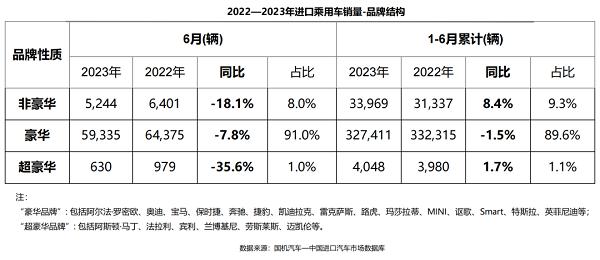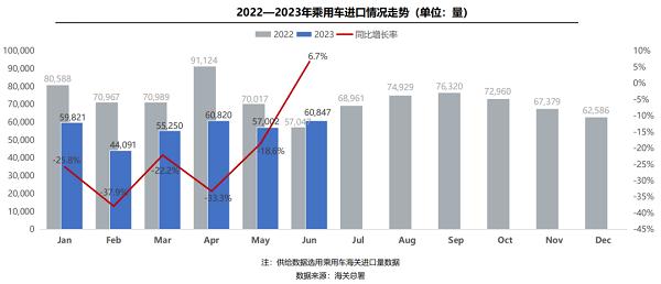 今年6月,我國(guó)乘用車(chē)進(jìn)口6.1萬(wàn)輛(含底盤(pán)),同比增長(zhǎng)6.7%;1-6月累計(jì)進(jìn)口33.8萬(wàn)輛,同比下滑23.3%,主要原因?yàn)閲?guó)內(nèi)市場(chǎng)消費(fèi)結(jié)構(gòu)改變及電動(dòng)化轉(zhuǎn)型降低了對(duì)燃油車(chē)的需求。銷(xiāo)量方面,6月,進(jìn)口乘用車(chē)終端銷(xiāo)售6.5萬(wàn)輛,同比下滑9.1%,環(huán)比增長(zhǎng)6.6%。1-6月,進(jìn)口乘用車(chē)?yán)塾?jì)銷(xiāo)售36.5萬(wàn)輛,同比微降0.6%;相比之下,新能源進(jìn)口車(chē)銷(xiāo)量同比漲幅接近七成。