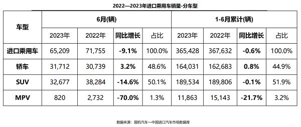 銷(xiāo)量方面,6月,進(jìn)口乘用車(chē)終端銷(xiāo)售6.5萬(wàn)輛,結(jié)束了連續(xù)四個(gè)月的增長(zhǎng)態(tài)勢(shì)。同比下滑9.1%,環(huán)比增長(zhǎng)6.6%。1-6月,進(jìn)口乘用車(chē)?yán)塾?jì)銷(xiāo)售36.5萬(wàn)輛,同比微降0.6%。
