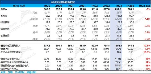 2023 年上半年,公司整車銷售業(yè)務(wù)實(shí)現(xiàn)營收 603 億元,同比增 23%,超出市場預(yù)期 10.8%。在銷量(不含領(lǐng)克、睿藍(lán))同比增長 12% 的但銷量數(shù)據(jù)市場已知的情況下,單車 ASP 超出市場預(yù)期 13.3%,帶動整車銷售業(yè)務(wù)大幅度超預(yù)期。