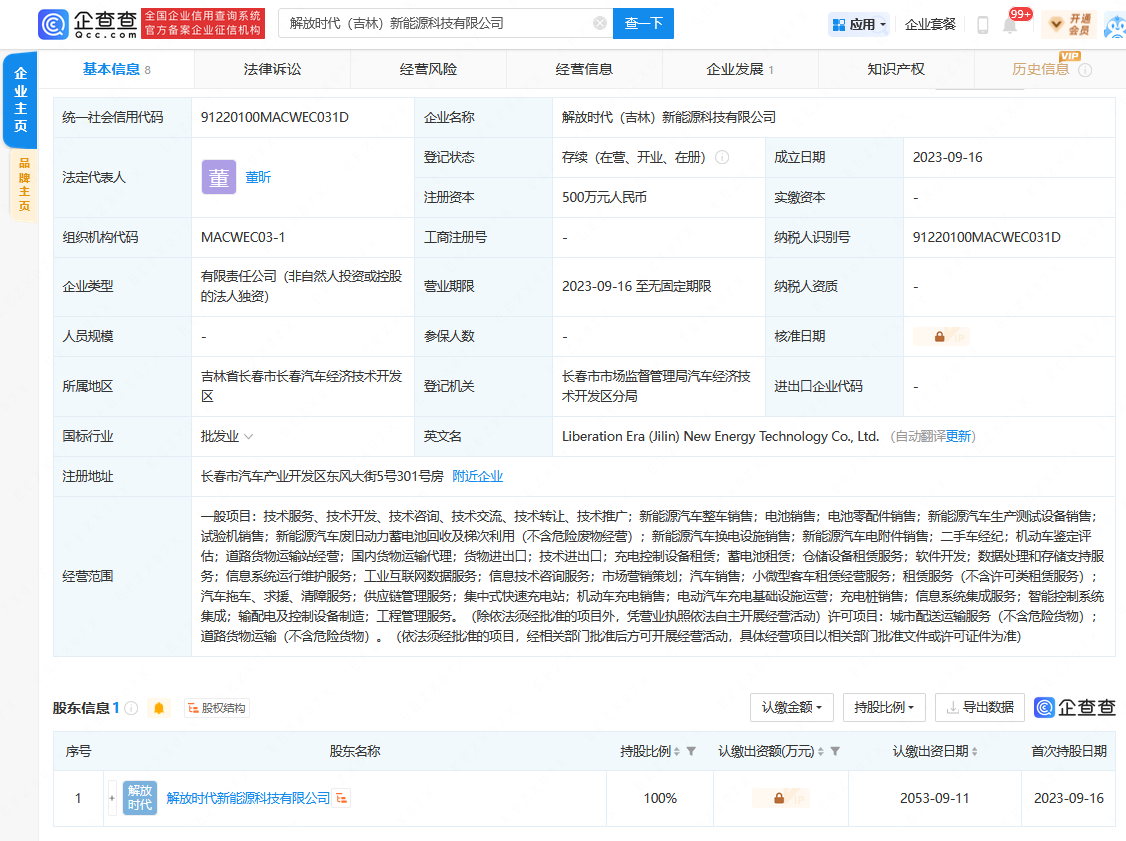 近日,解放時(shí)代(吉林)新能源科技有限公司成立,法定代表人為董昕,注冊資本500萬人民幣,經(jīng)營范圍含新能源汽車整車銷售、電池銷售、電池零配件銷售、電動(dòng)汽車充電基礎(chǔ)設(shè)施運(yùn)營;充電樁銷售;信息系統(tǒng)集成服務(wù);智能控制系統(tǒng)集成;輸配電及控制設(shè)備制造等。股權(quán)全景穿透圖顯示,該公司由解放時(shí)代新能源科技有限公司全資持股,后者由一汽解放汽車有限公司、寧德時(shí)代分別持股50%。