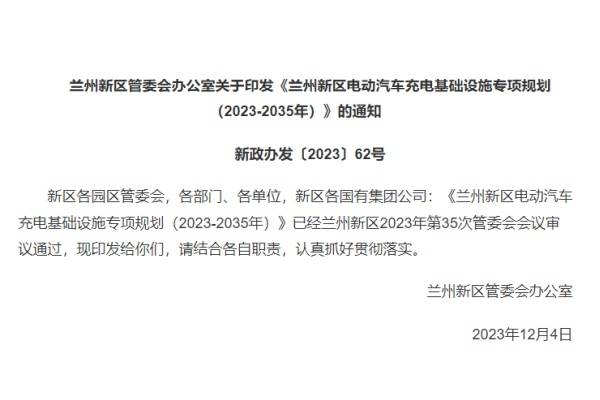 12月18日,蘭州新區(qū)管委會發(fā)布《蘭州新區(qū)電動汽車充電基礎(chǔ)設(shè)施專項規(guī)劃(2023-2035年)》。