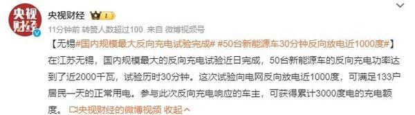 1月5日,據(jù)央視報道,近日在江蘇無錫,國內(nèi)規(guī)模最大的反向充電試驗完成,50臺新能源車的反向充電功率達到了近2000千瓦,試驗歷時30分鐘。這次試驗向電網(wǎng)反向放電近1000度,可滿足133戶居民一天的正常用電。參與此次反向充電響應(yīng)的車主,可獲得累計3000度電的充電額度。
