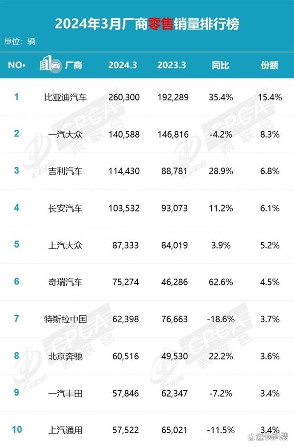 在乘聯(lián)會統(tǒng)計的2024年3月廠商零售銷量排行榜中,銷量Top 10廠商中,除豪華品牌北京奔馳外,其他品牌的銷量同比變化趨勢十分明顯——自主品牌如比亞迪、吉利、長安、奇瑞均出現(xiàn)了較大的增幅;而合資品牌均下降或僅保持微增。