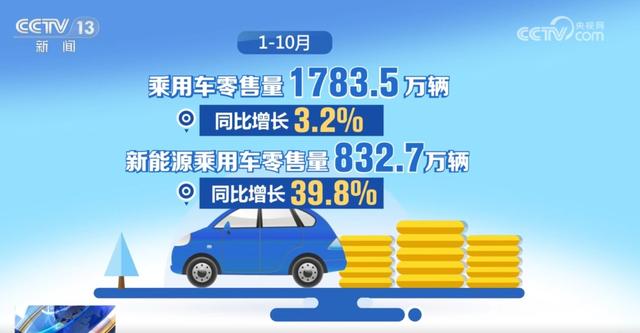 在以舊換新政策的帶動下,汽車銷量也有了明顯增長。10月份,乘用車零售量226.1萬輛,同比增長11.3%,增速較9月加快6.8個百分點。其中,新能源乘用車零售量119.6萬輛,同比增長56.7%,增速較9月加快5.8個百分點,占乘用車零售量的比重達52.9%。1—10月,乘用車零售量1783.5萬輛,同比增長3.2%。其中,新能源乘用車零售量832.7萬輛,同比增長39.8%。(央視網(wǎng))