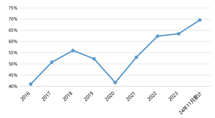 其中,我國新能源車銷售領(lǐng)域在全球的占比,早在2023年就已達(dá)到64%的絕對高位;2024年1-11月,我國新能源車銷售領(lǐng)域全球占比繼續(xù)保持69.6%的份額,其中10-11月我國新能源乘用車世界份額更是達(dá)到76%。(數(shù)據(jù)來源:Wind、中信建投期貨、乘聯(lián)會(huì),統(tǒng)計(jì)區(qū)間:2023.01.01-2024.11.30)