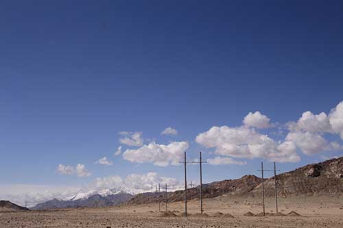 項(xiàng)目身處青海都蘭一望無際的戈壁灘,氣候干燥,風(fēng)沙肆虐,寒風(fēng)刺骨,自然條件十分惡劣,電話信號時有時無。春夏相接的五月,沙塵暴和冰雹更是常常輪番“光顧”施工現(xiàn)場,給施工進(jìn)度和安全管理帶來不小的挑戰(zhàn)。對此,中國安能第二工程局青海風(fēng)電項(xiàng)目部員工對工作沒有絲毫懈怠,大家精誠團(tuán)結(jié)、眾志成城,施工生產(chǎn)穩(wěn)步推進(jìn)。此次放線工作于5月28日在5#地塊正式開始,該區(qū)段包含146基鐵塔,放線長度37900米,109.8噸重的導(dǎo)線翻越山巒,在平均海拔3000米的荒漠戈壁攀行30天,最終于五標(biāo)段2-G67號塔位進(jìn)行交匯。