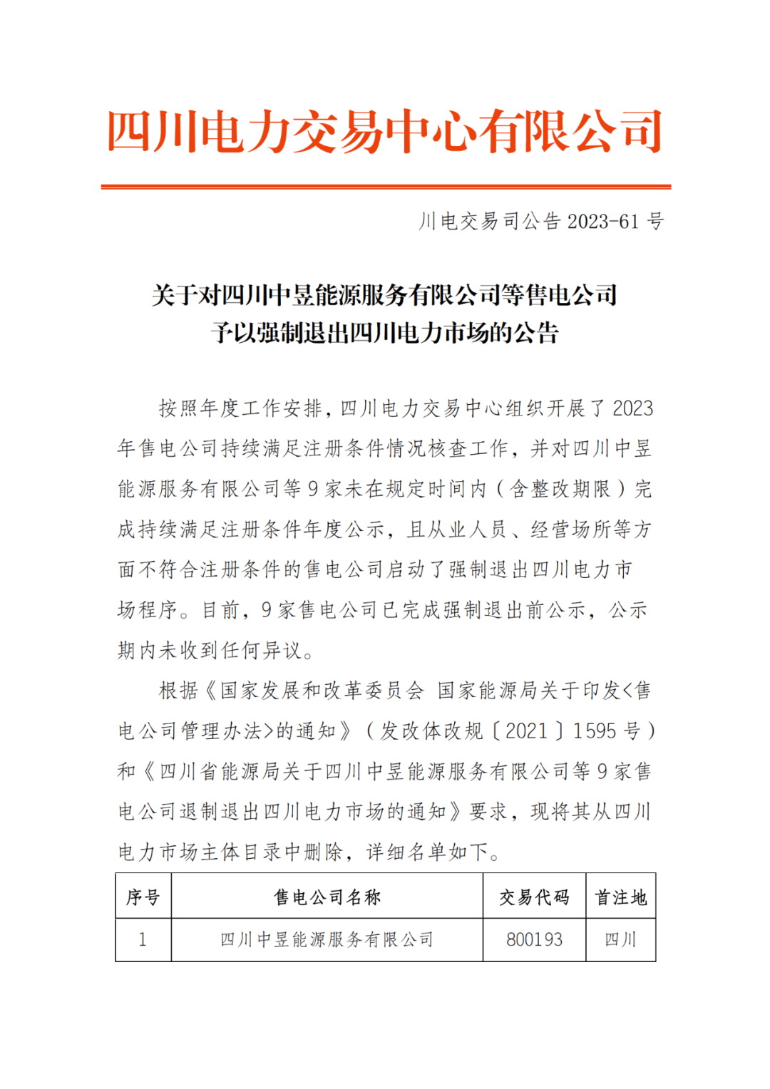 8月7日,四川電力交易中心發(fā)布《關于對四川中昱能源服務有限公司等售電公司予以強制退出四川電力市場的公告》。詳情如下: