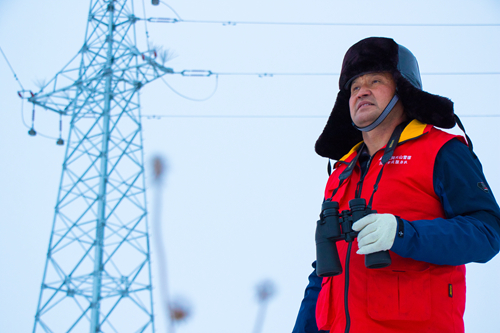 阿曼吐爾·依沙木丁在零下25攝氏度的嚴(yán)寒天,巡視海拔2000余米烏孫山上的供電線路。(國網(wǎng)伊犁伊河供電公司供圖)