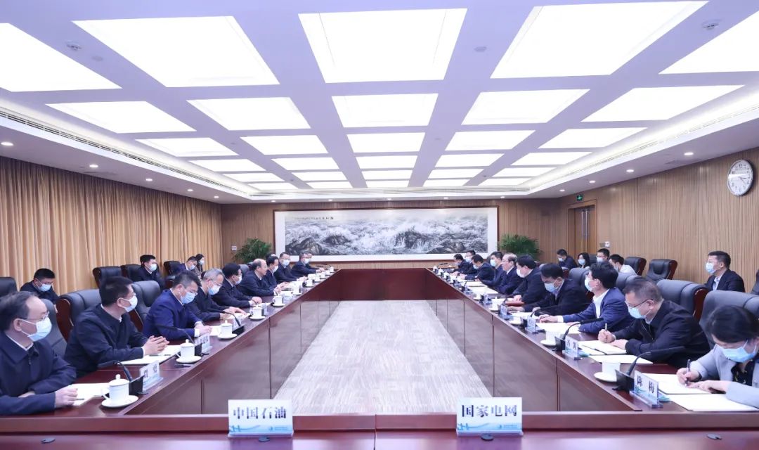 辛保安歡迎戴厚良一行到訪國家電網(wǎng)公司,感謝中國石油積極支持和參與新型電力系統(tǒng)技術(shù)創(chuàng)新聯(lián)盟的組建。