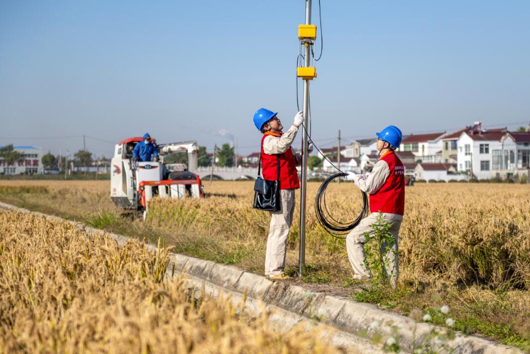 ▲國(guó)網(wǎng)江蘇電力共產(chǎn)黨員服務(wù)隊(duì)在田間地頭開(kāi)展農(nóng)業(yè)生產(chǎn)用電服務(wù)。