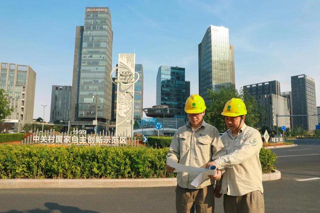 國網(wǎng)北京亦莊供電公司員工在北京經(jīng)開區(qū)中關(guān)村國家自主創(chuàng)新示范區(qū)巡檢重點(diǎn)線路,保障高溫天氣下電網(wǎng)運(yùn)行平穩(wěn)。