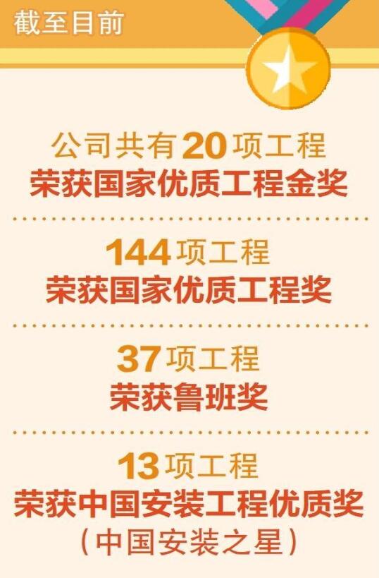 截至目前,公司共有20項工程榮獲國家優(yōu)質(zhì)工程金獎,144項工程榮獲國家優(yōu)質(zhì)工程獎,37項工程榮獲魯班獎,13項工程榮獲中國安裝工程優(yōu)質(zhì)獎(中國安裝之星),在電力行業(yè)始終保持第一,在我國工程建設(shè)領(lǐng)域處于領(lǐng)先地位。