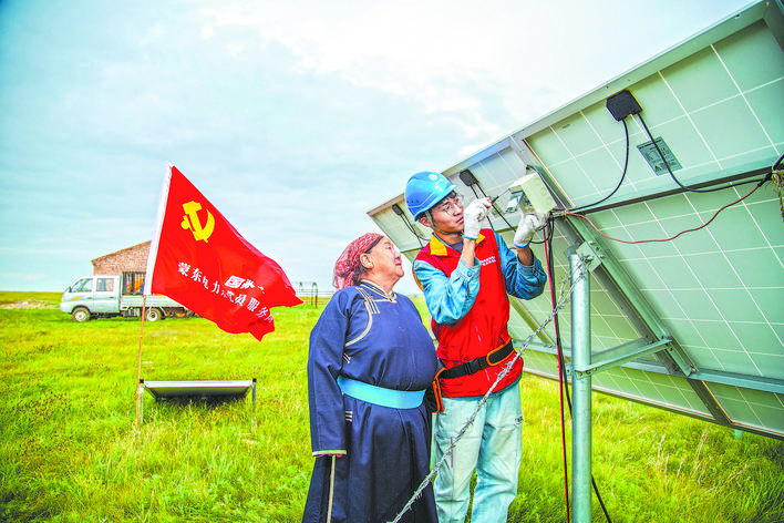 國家電網(wǎng)蒙東電力(呼倫貝爾新巴爾虎右旗)共產(chǎn)黨員服務(wù)隊隊員為牧民檢查光伏板。宋天培 攝