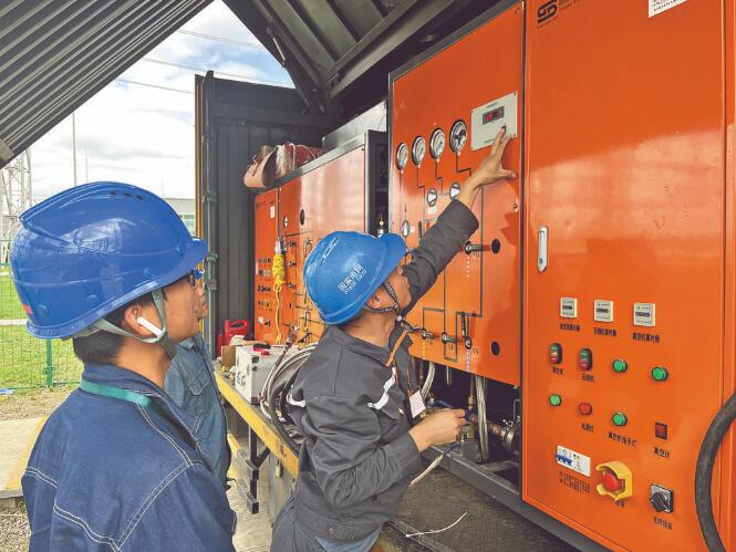 “更換過(guò)程中,為了保證舊斷路器不受潮,我們?cè)诓鹣碌奶坠芗氨倔w氣室內(nèi)及時(shí)充入高純氮?dú)獠⑥D(zhuǎn)移存放。在支架及本體就位后,套管要在環(huán)境滿足條件的情況下才能進(jìn)行安裝。”國(guó)網(wǎng)甘肅超高壓公司變電檢修中心變電一次檢修五班班長(zhǎng)邵建軍說(shuō)。檢修人員在保證新斷路器安裝質(zhì)量的同時(shí),還要開展六氟化硫氣體微水及組分檢測(cè)、斷路器常規(guī)試驗(yàn)和耐壓試驗(yàn)等一系列工作,確保斷路器更換質(zhì)量合格。