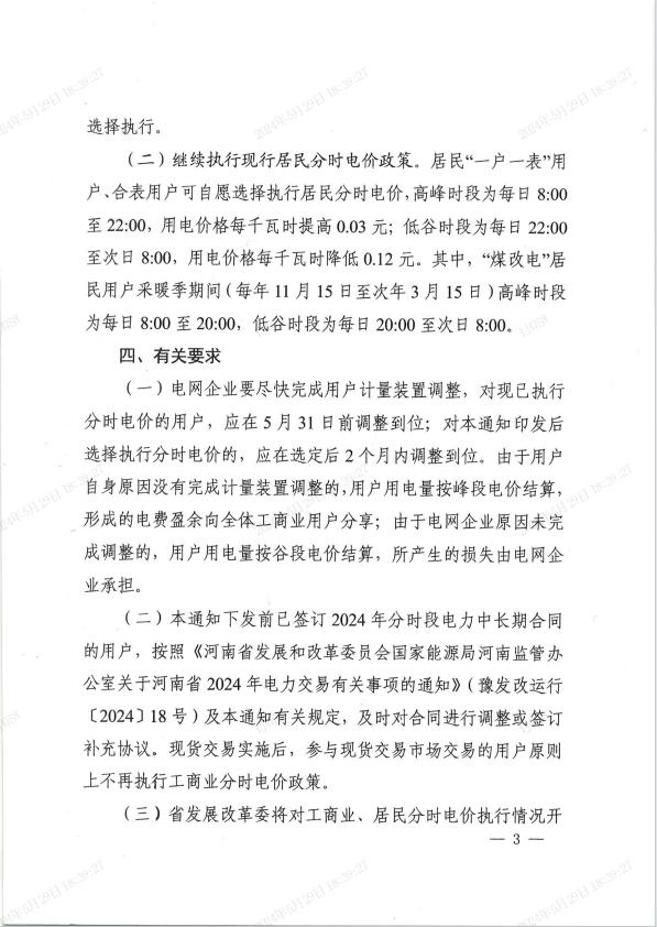 (二)本通知下發(fā)前已簽訂2024年分時(shí)段電力中長期合同的用戶,按照《河南省發(fā)展和改革委員會(huì)國家能源局河南監(jiān)管辦公室關(guān)于河南省2024年電力交易有關(guān)事項(xiàng)的通知》(豫發(fā)改運(yùn)行〔2024〕18號(hào))及本通知有關(guān)規(guī)定,及時(shí)對(duì)合同進(jìn)行調(diào)整或簽訂補(bǔ)充協(xié)議。現(xiàn)貨交易實(shí)施后,參與現(xiàn)貨交易市場交易的用戶原則上不再執(zhí)行工商業(yè)分時(shí)電價(jià)政策。