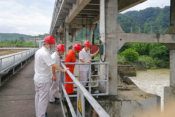 圖為檢查組正在檢查遠程泵房水壩閘門