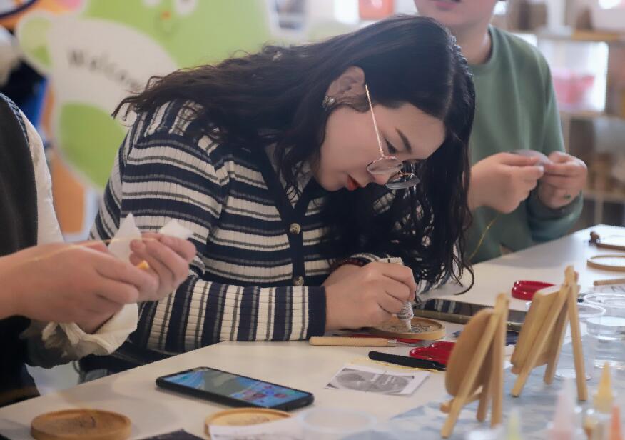 活動中大家興致勃勃地上手在木質(zhì)杯墊上制作琺瑯畫,用細(xì)膩柔軟的金絲,貼在裝飾圖紋上,通過配色、填沙等步驟,逐步制作出一件件別具一格、匠心獨(dú)制的藝術(shù)作品,大家興趣盎然,彼此交流,共同分享動手制作的體會和收獲的喜悅,共品非遺藝術(shù)魅力。掐絲琺瑯工藝是一種傳統(tǒng)的中國手工藝,用金屬細(xì)絲掐出圖案后填充各種顏色的琺瑯彩料,經(jīng)過多道工序,制成精美器物。本次體驗(yàn)活動進(jìn)行掐絲琺瑯手工杯墊制作,作品可以永久保存,永不褪色,并具有很好的觀賞性和收藏價值。