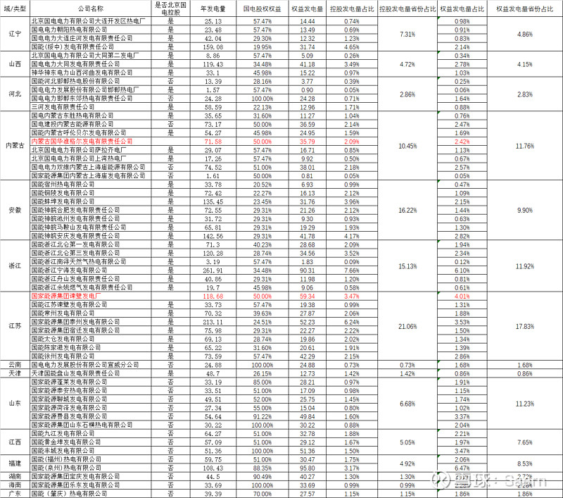 國(guó)電的火電有一些明顯的特點(diǎn),就是控股火電發(fā)電量多,權(quán)益相對(duì)低,也有人質(zhì)疑國(guó)電的火電資產(chǎn)差,位置不好。那么國(guó)電的火電到底分布如何呢,經(jīng)過(guò)一個(gè)個(gè)的股權(quán)查詢(紅色兩家還沒(méi)查到用50%替代,后續(xù)翻報(bào)表后更新),按照2022年全年剝離寧夏火電后的數(shù)據(jù),我做了統(tǒng)計(jì)和分析。大家可以看結(jié)論,到底如何大家自己判斷。$國(guó)電電力(SH600795)$ $大唐發(fā)電(00991)$ $華電國(guó)際(SH600027)$ 華能國(guó)際
