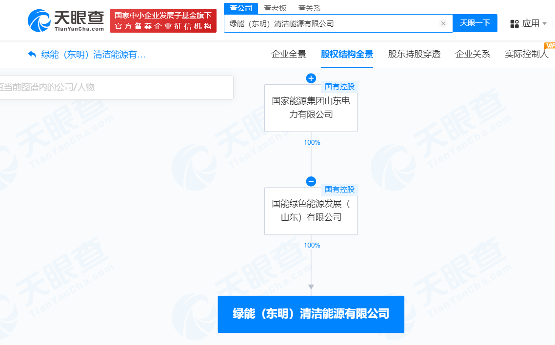 股權(quán)全景穿透圖顯示,該公司由國(guó)能綠色能源發(fā)展(山東)有限公司全資持股,后者由國(guó)電電力間接全資持股。