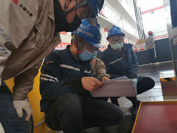 張博(左一)為青年職工講解轉(zhuǎn)輪支架縫隙測(cè)試儀使用方法