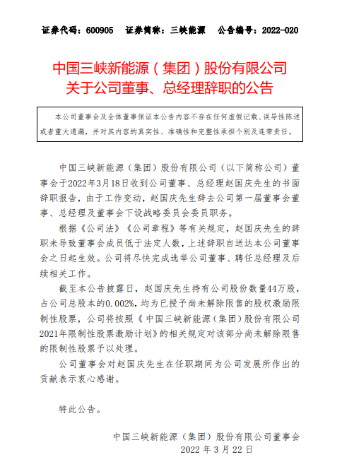 3月21日,三峽能源發(fā)布公告稱,公司董事會(huì)于3月18日收到公司董事、總經(jīng)理趙國(guó)慶的書面辭職報(bào)告,由于工作變動(dòng),趙國(guó)慶先生辭去公司第一屆董事會(huì)董事、總經(jīng)理及董事會(huì)下設(shè)戰(zhàn)略委員會(huì)委員職務(wù)。