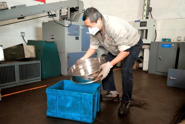 圖為該公司燃料采制員對(duì)存查煤樣抽查樣品進(jìn)行制備