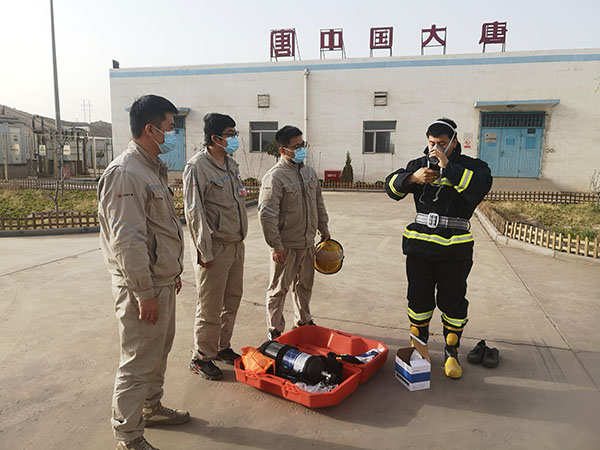 首先開展的是干粉滅火器實操演練。運維人員取出4具即將送檢的滅火器,用小推車裝好干柴放置在空曠地點,駐站人員講解了滅火器檢查方法和使用流程后,在確保安全的情況下將小推車內(nèi)的干柴點燃。一名工作人員用滅火器將車內(nèi)的火焰撲滅,再重新點燃,下一名人員繼續(xù)操作,最終達到參訓人員全部能夠熟練使用滅火器的目的;其次,開展正壓呼吸器使用實操演練。在每個人都熟練掌握說明書上使用步驟和注意事項后,每名工作人員都穿戴正壓呼吸器一次,如果穿戴流程錯誤立即糾正并重新穿戴;再次,開展消防戰(zhàn)斗服穿戴實操演練。有火電消防工作經(jīng)驗的人員對戰(zhàn)斗服使用步驟進行詳細講解,每名工作人員都穿戴消防戰(zhàn)斗服一次,達到全員均能熟練穿戴的目的;最后,所有參訓人員都組裝并佩戴防毒面具一次。