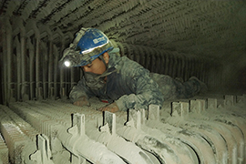 管排余溫散發(fā)熱浪,動(dòng)一下粉塵便像揚(yáng)沙一樣落下,眼前一片迷離。借著爐膛內(nèi)頭燈的照明,能清晰看到在他們睫毛上落定的塵埃......