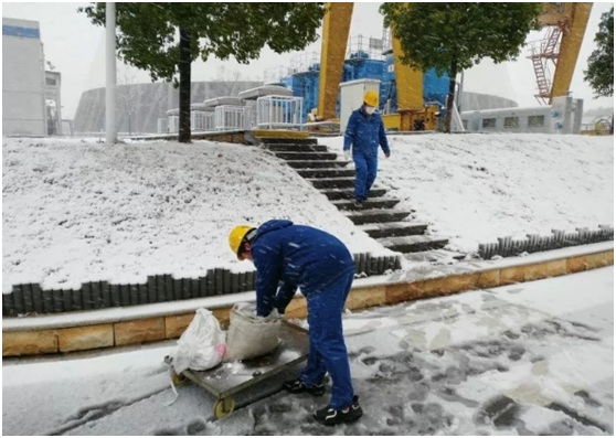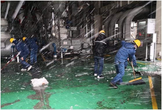 早在幾天前,一收到市氣象局發(fā)布的大雪預(yù)警信息后,楊坤就帶領(lǐng)著六值班組成員進行相關(guān)重點區(qū)域的學習和操作。工作開始前,楊坤再三叮囑值內(nèi)成員要采取好防護保暖措施,預(yù)防風寒感冒。大雪襲來后,楊坤第一時間帶領(lǐng)值內(nèi)成員在部門統(tǒng)籌安排下,前往生產(chǎn)現(xiàn)場清雪、撒鹽、鋪設(shè)防滑袋等相關(guān)安全保障措施。風雪中,楊坤拿來了幾個大鐵鍬,在鍋爐12米的給煤機平臺上將凍上的冰面一片片敲裂,然后再順著雪一道鏟到通道的兩旁,最后撒上鹽,在相關(guān)區(qū)域鋪上麻袋。有人問他怎么做得這么熟練,他笑著說自己打小在東北的家鄉(xiāng)就干這些事。
