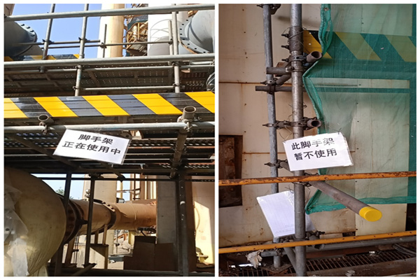 針對(duì)檢查發(fā)現(xiàn)的現(xiàn)場(chǎng)腳手架使用狀態(tài)信息無(wú)法識(shí)別,安全警示不到位的問(wèn)題,公司領(lǐng)導(dǎo)高度重視,EHS部立即組織各檢修單位召開(kāi)專題會(huì),明確要求各單位進(jìn)一步完善腳手架搭建驗(yàn)收后的管理要求,對(duì)現(xiàn)場(chǎng)所有腳手架進(jìn)行排查梳理,完善“搭建中、驗(yàn)收合格可使用、暫不使用、待拆除”等各種狀態(tài)信息牌,確保高處作業(yè)風(fēng)險(xiǎn)可控、在控。