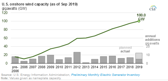 根據(jù)美國能源信息管理局(EIA)數(shù)據(jù),截至2019年9月,美國的陸上風(fēng)電累計裝機(jī)容量已超過100 GW,到2020年底可能達(dá)到122 GW。
