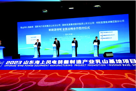 活動現(xiàn)場,乳山與國家電力投資集團山東分公司、國家能源集團投資山東分公司、明陽智慧能源集團股份公司等8家企業(yè)現(xiàn)場簽署合作協(xié)議,同時,啟動了國華科技創(chuàng)新中心建設。