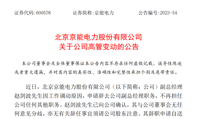 公告披露,近日,京能電力副總經(jīng)理趙劍波先生因工作調(diào)動原因,申請辭去公司副總經(jīng)理職務,不再擔任公司任何其他職務。趙劍波先生已向公司確認,其與公司董事會無任何意見分歧,亦無有關(guān)辭任事宜須請公司股東注意。其辭職申請自送達公司董事會時生效。本次人事變動不會影響公司相關(guān)工作的正常開展。