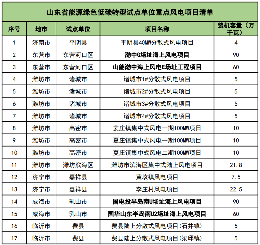 同時(shí),該文件還公布了山東省能源綠色低碳轉(zhuǎn)型試點(diǎn)單位重點(diǎn)項(xiàng)目清單。清單包含24個(gè)風(fēng)電項(xiàng)目,總裝機(jī)容量785.1萬千瓦,其中海上風(fēng)電項(xiàng)目共計(jì)4個(gè),總裝機(jī)容量300萬千瓦。