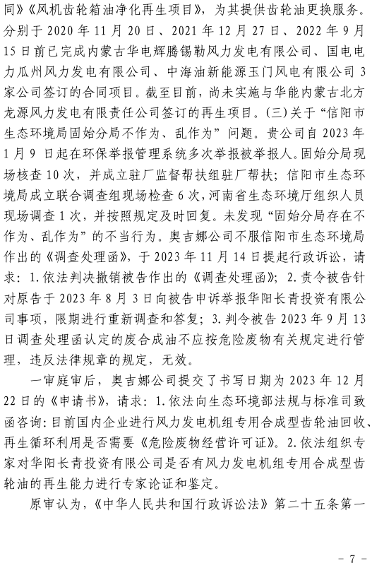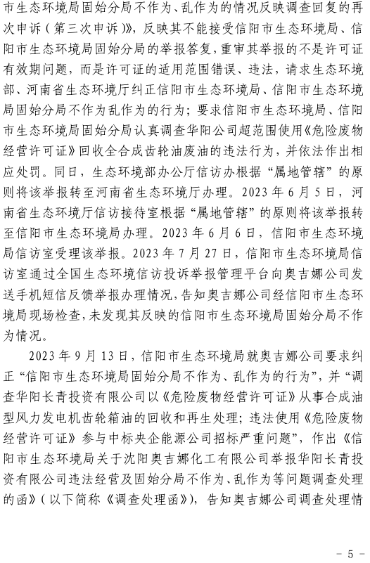 2023年3月9日,奧吉娜公司收到固始分局通過12369環(huán)境信訪平臺的短信答復(fù):“反映問題不屬實”。3月10日,奧吉娜公司向固始分局負(fù)責(zé)人電話詢問,其解釋稱:經(jīng)調(diào)查核實,華陽長青公司沒有再生風(fēng)電潤滑油銷售,出售的是新油。否定了奧吉娜公司的舉報內(nèi)容。對此,奧吉娜公司表示強(qiáng)烈不滿。3月11日,奧吉娜公司向環(huán)境部投訴固始分局的不作為和亂作為。2023年5月26日,奧吉娜公司收到12369環(huán)境信訪平臺的短信答復(fù)。答復(fù)部門為信陽環(huán)境局。令人啼笑皆非的是,答復(fù)稱,華陽長青的許可證有效期沒有問題,與舉報內(nèi)容風(fēng)馬牛不相及。2023年6月13日,奧吉娜公司再次向環(huán)境部提出申訴,指出,奧吉娜舉報的不是許可證有效期問題,而是許可證的適用范圍錯誤、違法。2023年7月27日,奧吉娜公司收到回復(fù)稱,經(jīng)信陽市生態(tài)環(huán)境局現(xiàn)場檢查,未發(fā)現(xiàn)固始分局不作為情況。2023年8月3日,奧吉娜公司向河南省生態(tài)環(huán)境廳(以下稱:環(huán)境廳)舉報信陽環(huán)境局包庇固始分局的行為。環(huán)境廳對此高度重視,有關(guān)處長和奧吉娜公司負(fù)責(zé)人進(jìn)行了面談。2023年9月13日,信陽環(huán)境局向奧吉娜公司致《信陽市生態(tài)環(huán)境局關(guān)于沈陽奧吉娜化工有限公司舉報華陽長青投資有限公司違法經(jīng)營及固始分局不作為、亂作為等問題調(diào)查處理的函》。函中:一是,以“齒輪箱”替換“齒輪箱油”,偷換概念;二是,做出了廢風(fēng)電合成(齒輪)油不屬于危險廢物的結(jié)論;三是,未發(fā)現(xiàn)固始分局存在不作為、亂作為的不當(dāng)行為。再次否定奧吉娜公司的舉報和投訴。