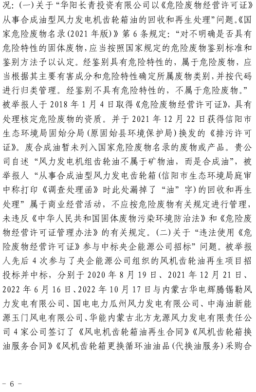 奧吉娜公司在參與各央企風(fēng)電潤滑油招投標(biāo)采購中發(fā)現(xiàn),注冊于河南省信陽市固始縣的華陽長青投資有限公司(以下稱:華陽長青公司),憑借其持有的《危險廢物經(jīng)營許可證》,屢次以“風(fēng)電齒輪油再生利用”的名義中標(biāo)。然而,奧吉娜公司發(fā)現(xiàn),華陽長青公司的《危險廢物經(jīng)營許可證》適用范圍并不包含合成型廢風(fēng)電齒輪油,屬于違規(guī)使用,涉嫌違反《環(huán)境保護(hù)法》。于是,2022年10月18日,奧吉娜公司依法向國家生態(tài)環(huán)境部(以下稱:環(huán)境部)進(jìn)行舉報。按程序,舉報調(diào)查由信陽市生態(tài)環(huán)境局固始分局(以下稱:固始分局)辦理。