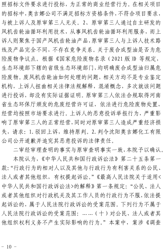 奧吉娜公司在再審申請中再次要求對兩個關(guān)鍵問題進(jìn)行法庭調(diào)查:1、《調(diào)查處理函》中的回答是錯誤的。信陽市生態(tài)環(huán)境局依據(jù)《國家危險廢物名錄(2021版)》認(rèn)定廢合成油不屬于危險廢物,不需要《危險廢物許可證》這種回答是錯誤的,而且作為一個市級行政職能部門信陽市生態(tài)環(huán)境局也無權(quán)作出這種認(rèn)定。2、根據(jù)奧吉娜公司對目前廢合成型風(fēng)電潤滑油再生技術(shù)的了解,華陽長青公司不具備廢合成型風(fēng)電潤滑油的再生能力,所謂的再生處理存在造假和欺騙的嫌疑!