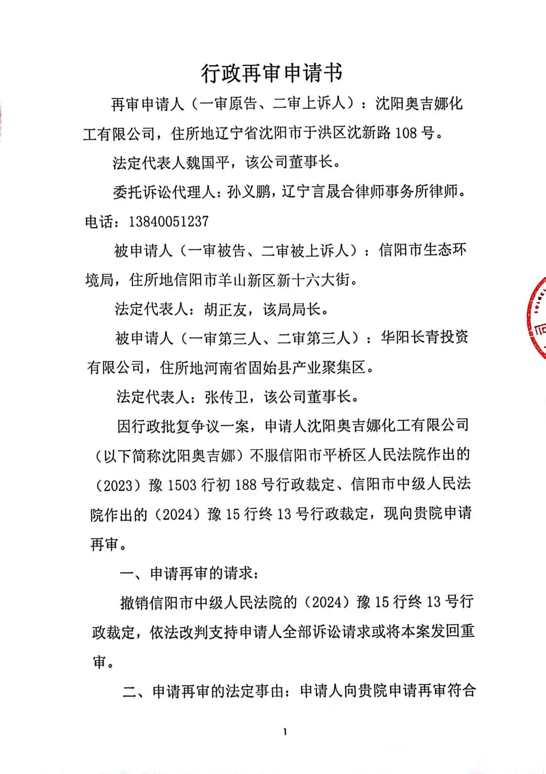 1、原告:沈陽奧吉娜化工有限公司,被告:信陽市環(huán)境局,第三人:華陽長青投資有限公司。
