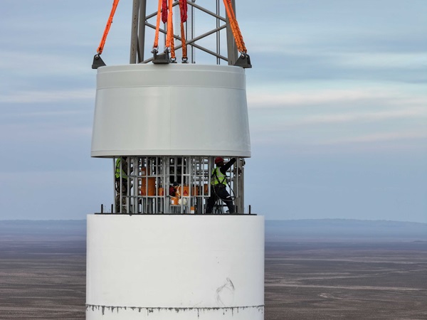 該首臺套風電機組并網,標志著全球規(guī)模化商用最大混塔風力發(fā)電機組在內蒙古能源集團成功發(fā)電運行。項目使用的風電設備單機容量10兆瓦,混塔高134.4米,整機高度140米,葉片長112米,風輪直徑230米,覆蓋及掃風面積更大,經濟性和發(fā)電量相對更高。值得一提的是,此項目風機塔筒由鋼筋混凝土中空、重力式基礎+上部高強混凝土預制管片疊合而成,是國內首次采用內張拉、預應力技術的10兆瓦混塔風力發(fā)電項目。塔筒內部預留孔洞固定鋼纜,鋼纜固定后進行水泥灌漿填充縫隙,風機運行中旋轉產生擺動,使用此技術,在擺動時,塔筒內部結構均勻受力,整體擺幅程度大大降低,使塔筒整體性更好、耐久性更強、預應力損失小,混塔結構塔筒優(yōu)勢突出。