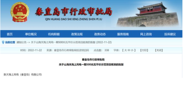 山海關(guān)海上風電一期500兆瓦平價示范項目位于山海關(guān)區(qū)與遼冀界線海域,北鄰山海關(guān)港區(qū),向南輻射至河北省省管海域與國管海域交界附近,東側(cè)為遼冀海域分界線,西側(cè)為秦皇島港東錨地。項目建設(shè)單位為新天海上風電(秦皇島)有限公司,風場總?cè)萘繛?00MW,擬設(shè)計安裝單機8MW以上風機,配建1座220千伏海上升壓站和1座陸上集控中心。項目估算總投資為62.3865億元。