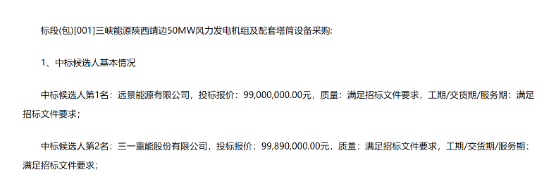 公告顯示,第一中標(biāo)候選人:遠(yuǎn)景能源有限公司,投標(biāo)報價:99,000,000.00元。第二中標(biāo)候選人:三一重能股份有限公司,投標(biāo)報價:99,890,000.00元。第三中標(biāo)候選人:明陽智慧能源集團(tuán)股份公司,投標(biāo)報價:104,000,000.00元。